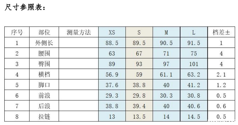 门襟拉链,工字扣,铆钉均采用 日本YKK品牌,经典舒适。尺寸参照表: