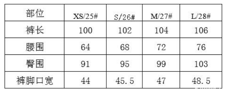 尺寸参照表: